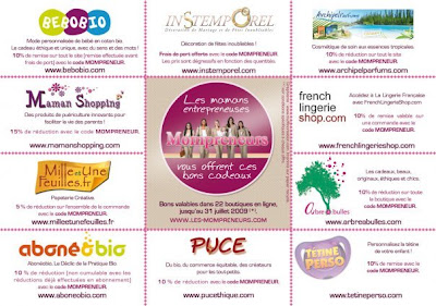 Ce chéquier vous fait bénéficier de remises exceptionnelles jusqu'au 31 juillet 2009 dans les 22 boutiques de nos partenaires mompreneurs !